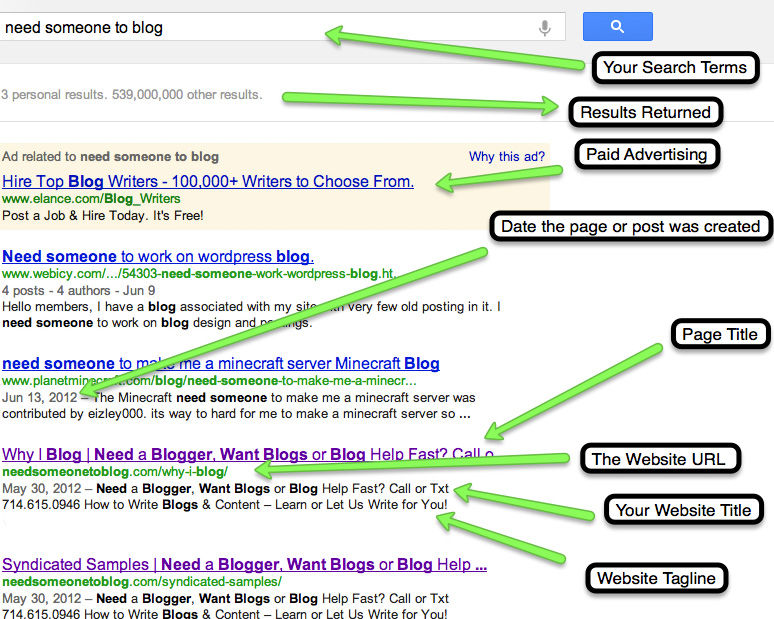 In the diagram on this post, I’ve pointed out some things that you may not have realized you are seeing when you conduct a Google search. Since these items are very important to the health of your SERP and page rank, I’ve included them in this blog post. Take a look and see if you can learn something just from the image. Combining the elements below with your desire and need for a safe blog post or safe blog posts, will help you in your quest to search engine optimize your site.
